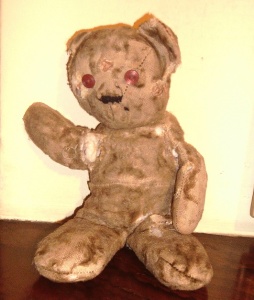 He used to be beautiful, with proper glass eyes and honey-coloured fur. I dropped him a few times and his eyes broke, and I kissed and hugged him so much that his fur is all worn away.